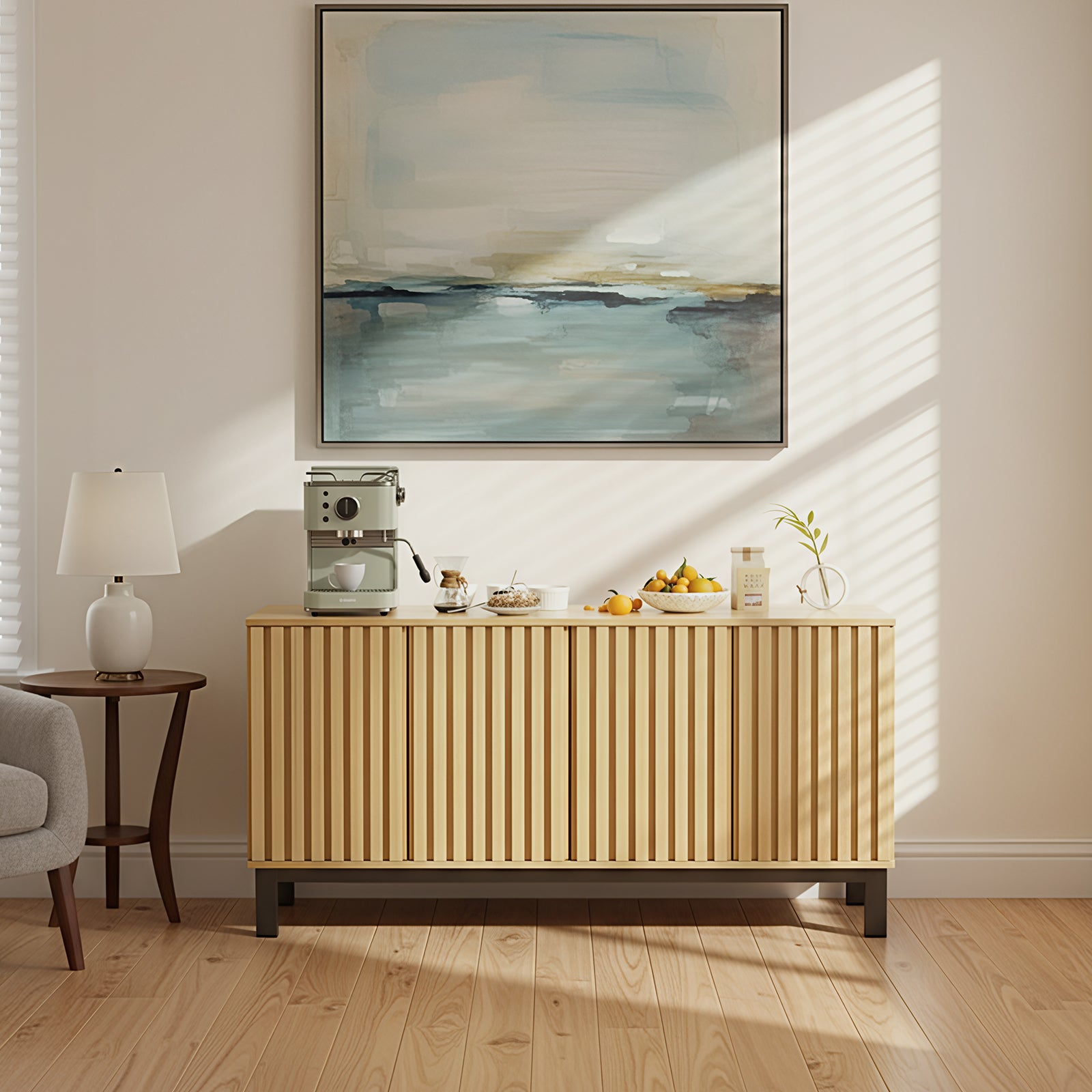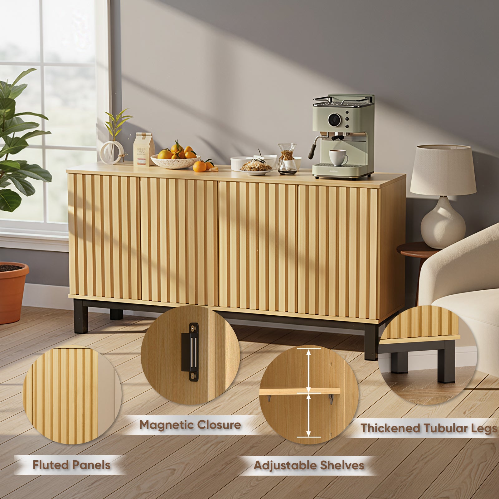 Enhance your living space with this modern buffet cabinet featuring a refined Oxford groove wave design. The elegant textured doors create a stylish focal point, while adjustable shelving and a versatile layout provide practical storage for everyday essentials. Designed for both beauty and function, this sideboard works seamlessly as a buffet table, entryway console, TV stand, or coffee bar. Reinforced with thickened metal legs and an anti-tip device, it delivers reliable stability and safety for long-term use in any home.