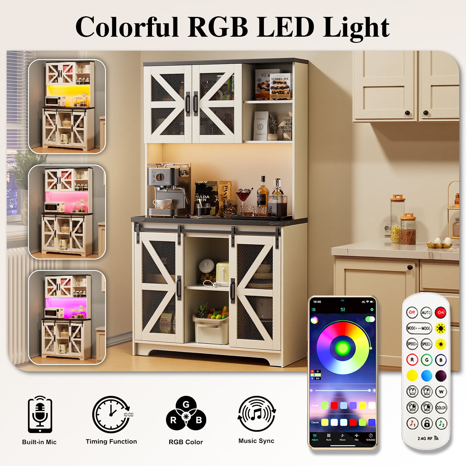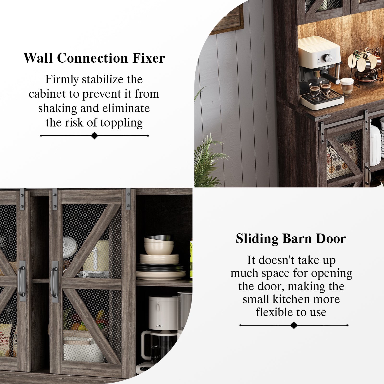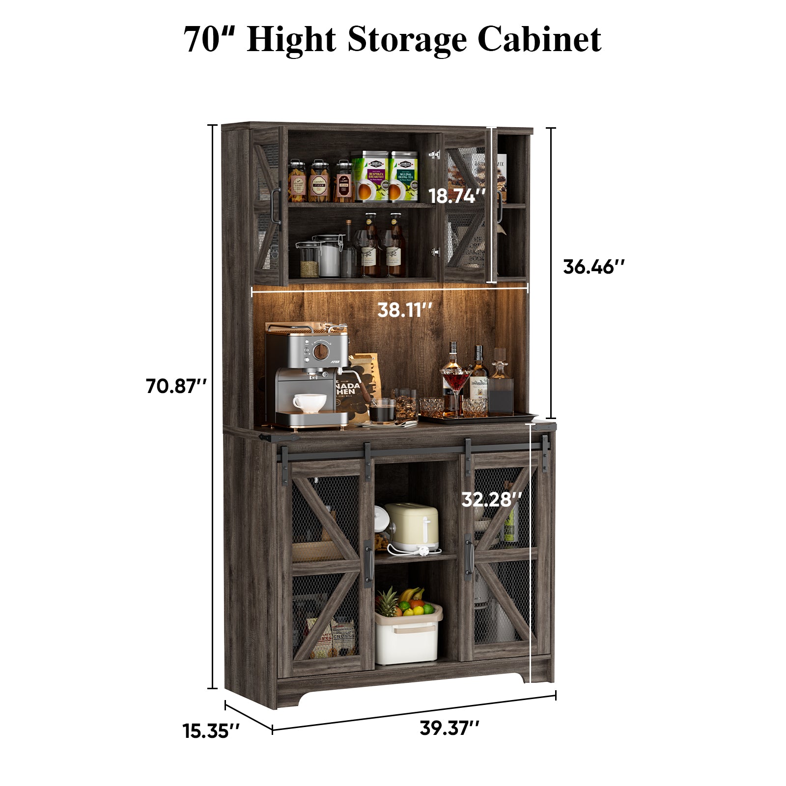 Save 50% - 70.87" Freestanding Kitchen Pantry Cabinet with LED Lights, Power Outlet & Barn Doors, Oak Hutch with Microwave Stand