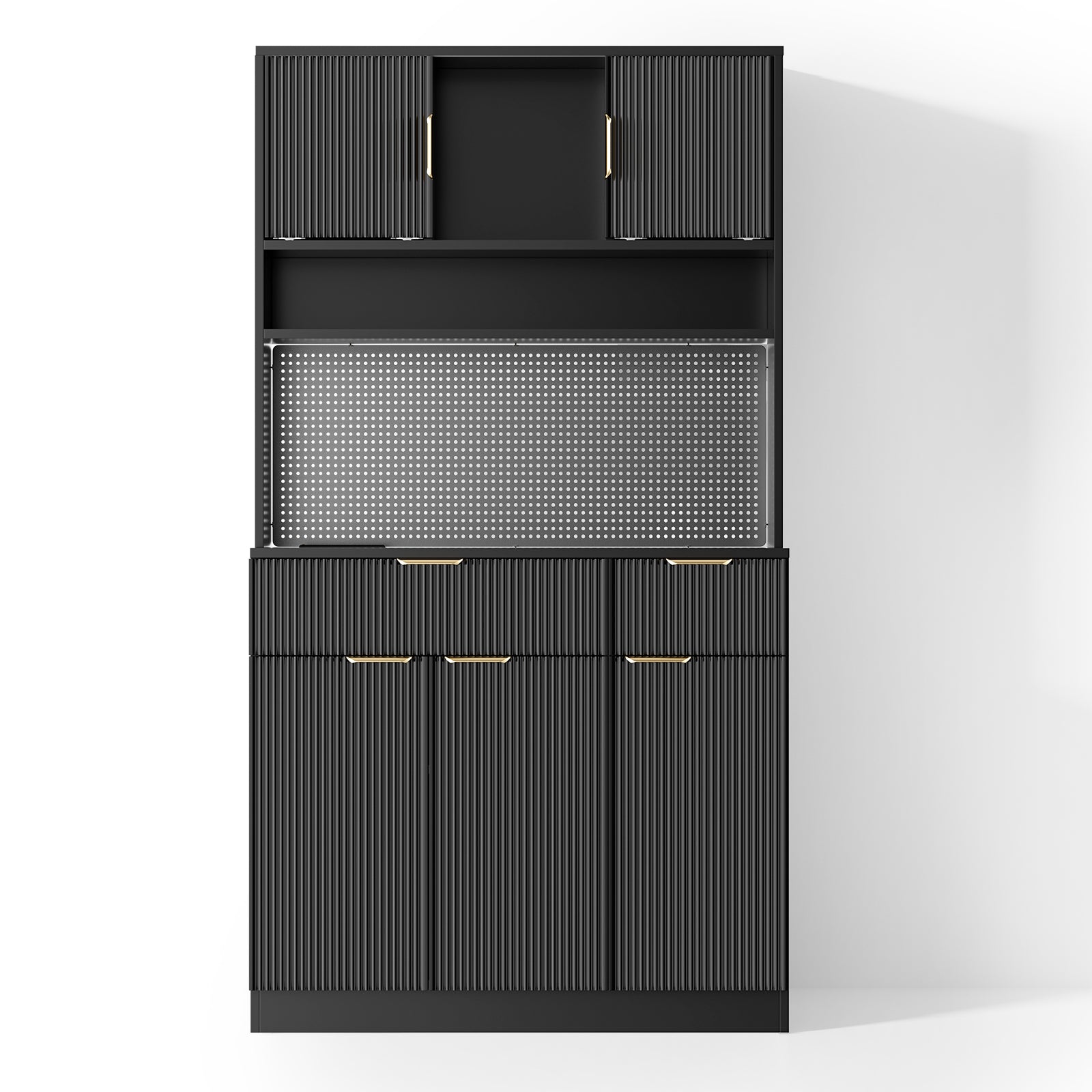 Save 50% - 71" Freestanding Kitchen Pantry Cabinet with Power Outlets & Pegboard, Black Hutch with Microwave Stand and Spice Rack