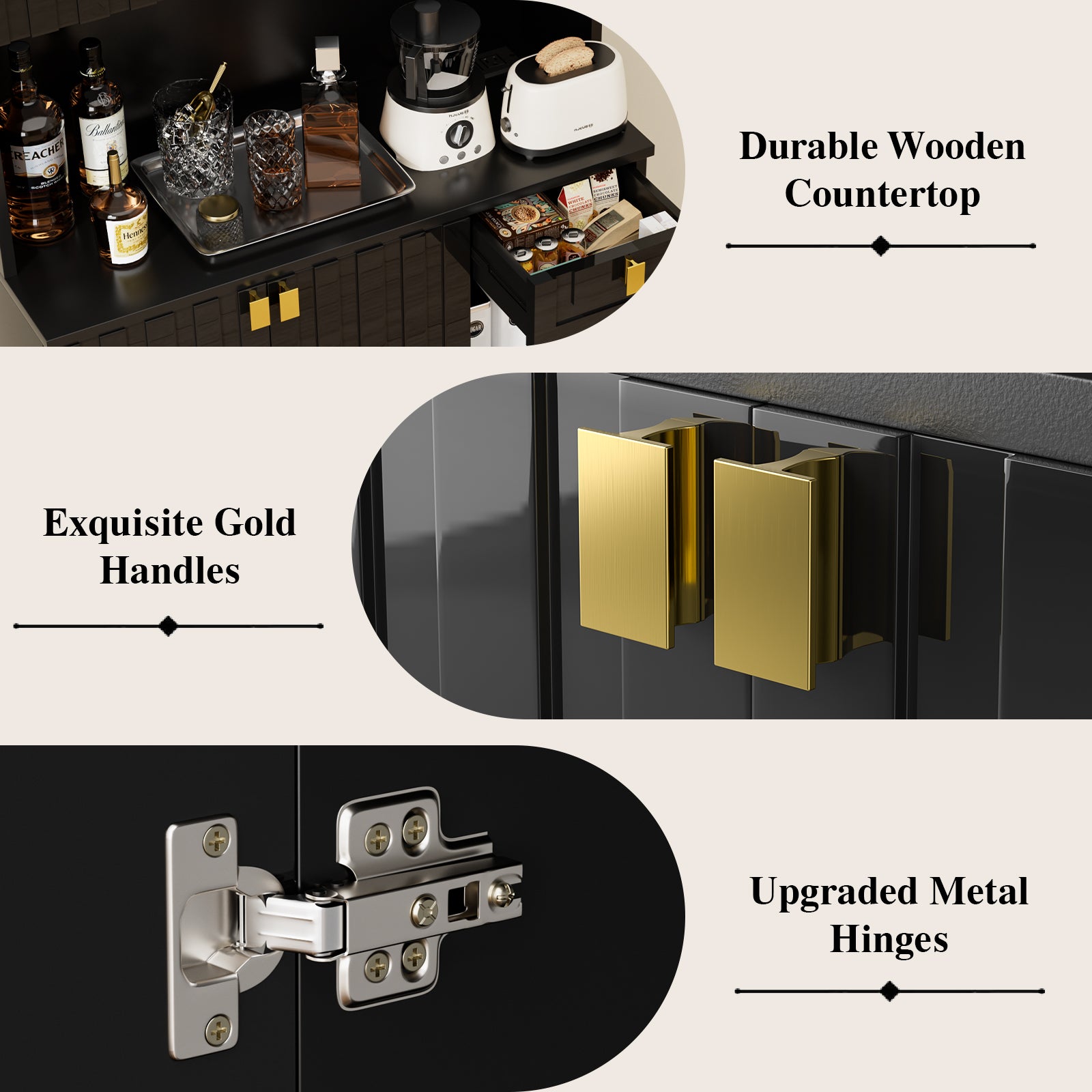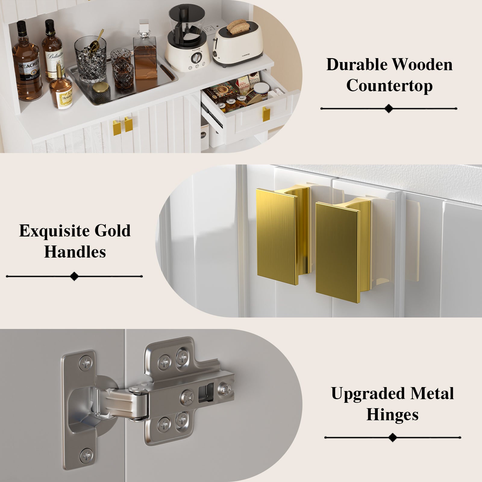 2. Integrated Storage Solutions: Includes 4 cabinet doors, 1 pull-out drawer, and 5 open shelves, plus a large countertop ideal for microwaves, coffee makers, or other appliances.