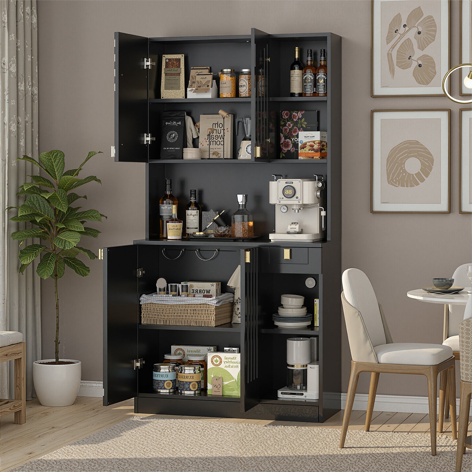 The Belord Kitchen Pantry Cabinet is a versatile, multi-functional storage solution designed to enhance any kitchen, dining room, or living space. Featuring a combination of open shelves, concealed cabinets, and a spacious countertop, it offers generous room to organize food, cookware, dinnerware, and small kitchen appliances. The durable engineered-wood construction with a waterproof finish ensures long-lasting performance, while adjustable shelves let you customize the space to suit your needs. A built-in charging station with AC outlets, USB, and Type-C ports adds modern convenience, making this tall pantry cabinet a perfect extension of your kitchen counter.