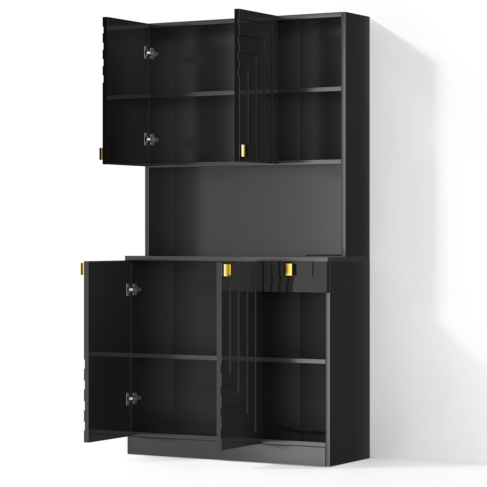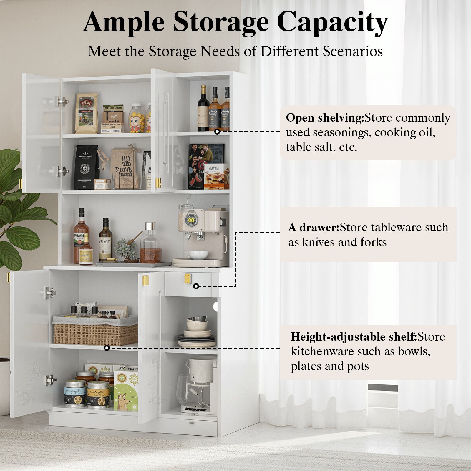 Save 50% - 71" Kitchen Pantry Cabinet with Power Outlet & Microwave Stand, High Gloss Buffet Organizer with Adjustable Shelves