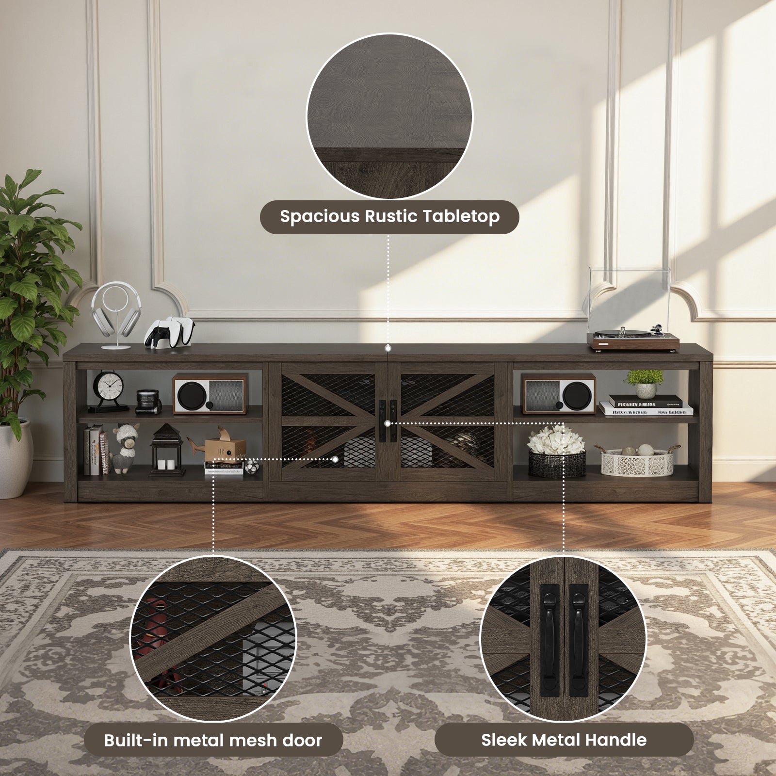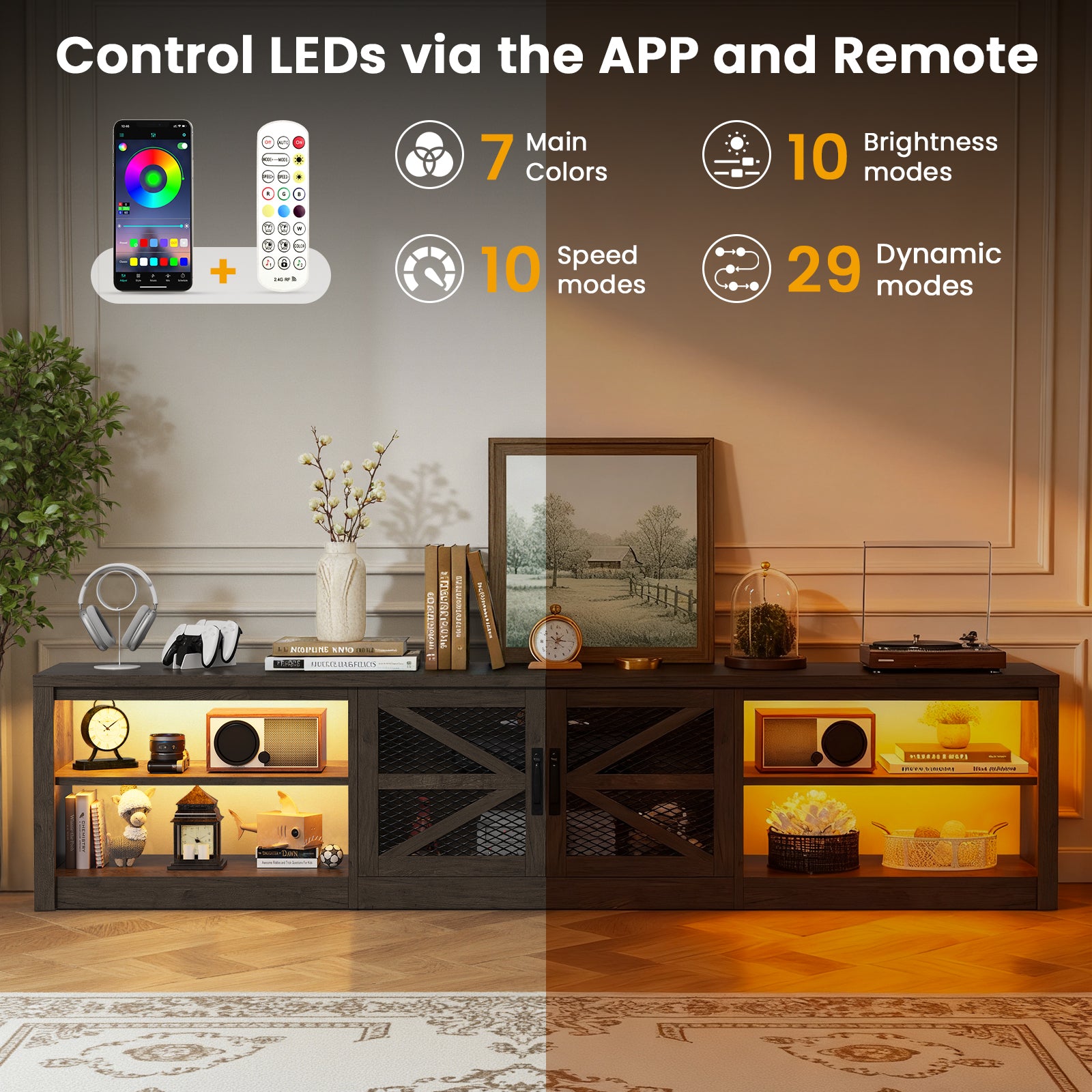 Save 50% - 79" Farmhouse TV Stand for Large Screens in Grey Oak with Ambient LED Lighting