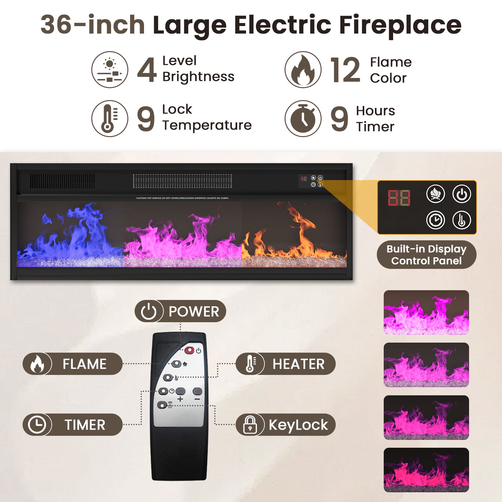 4. Convenient Control: Adjust temperature, flame effects, brightness, and timer settings using the built-in control panel or included remote.