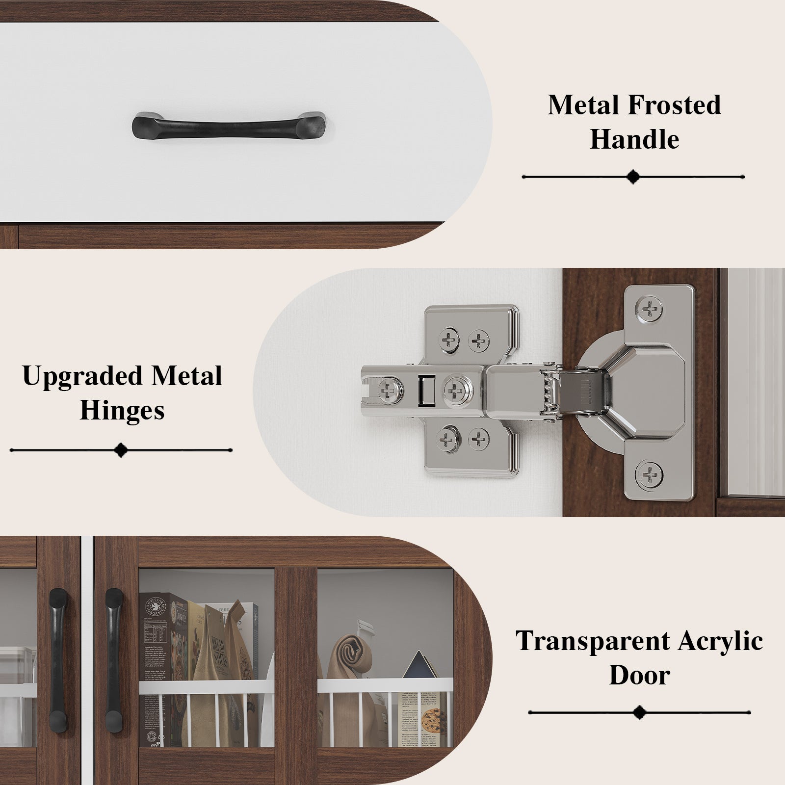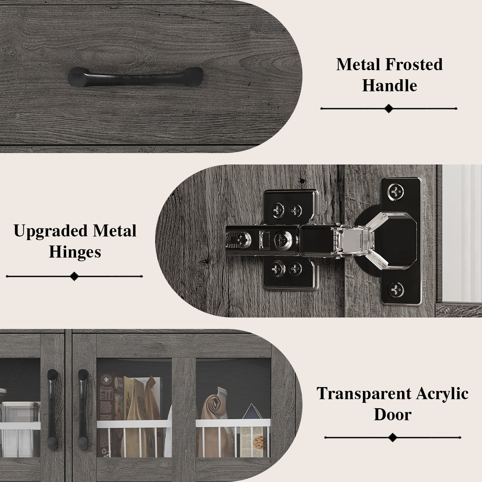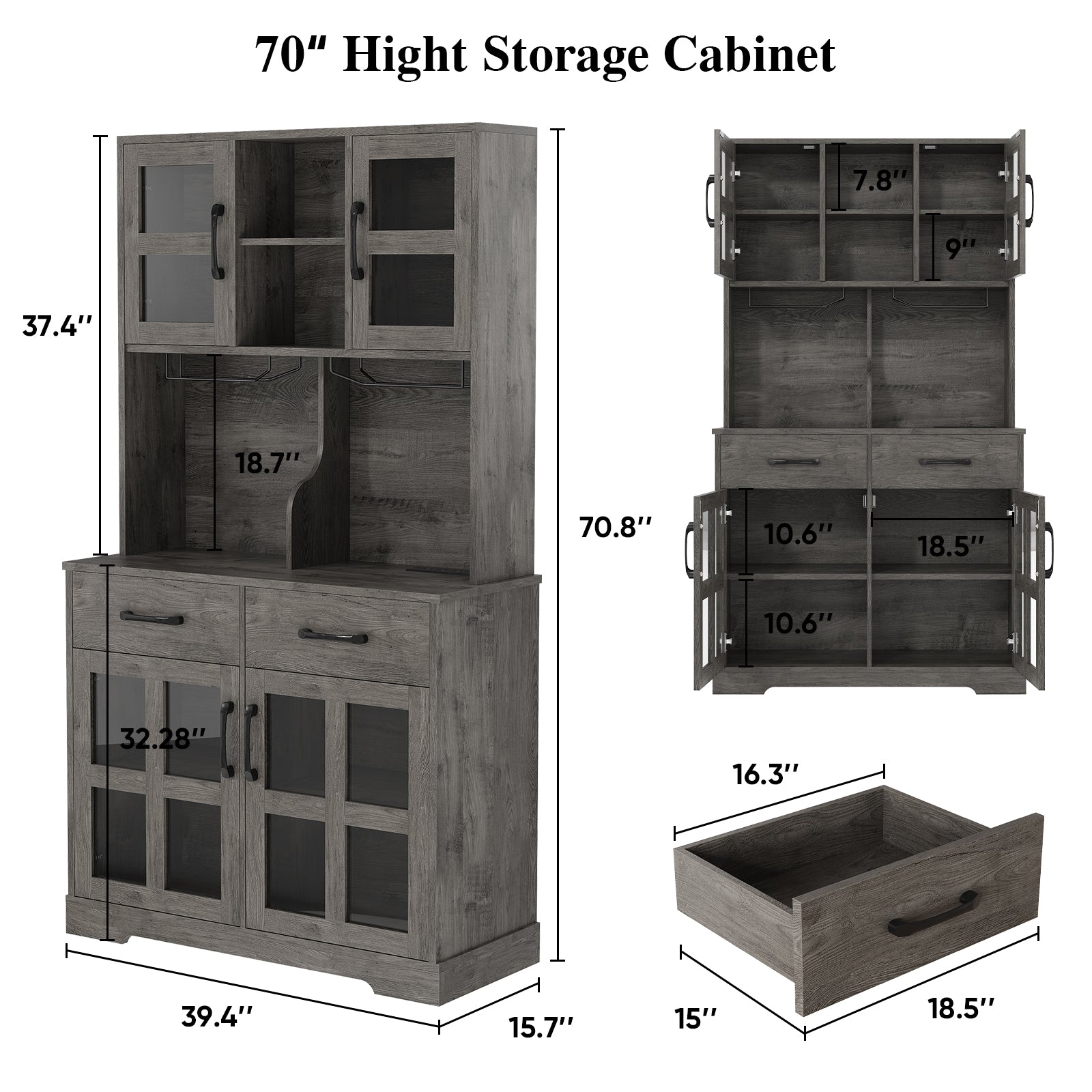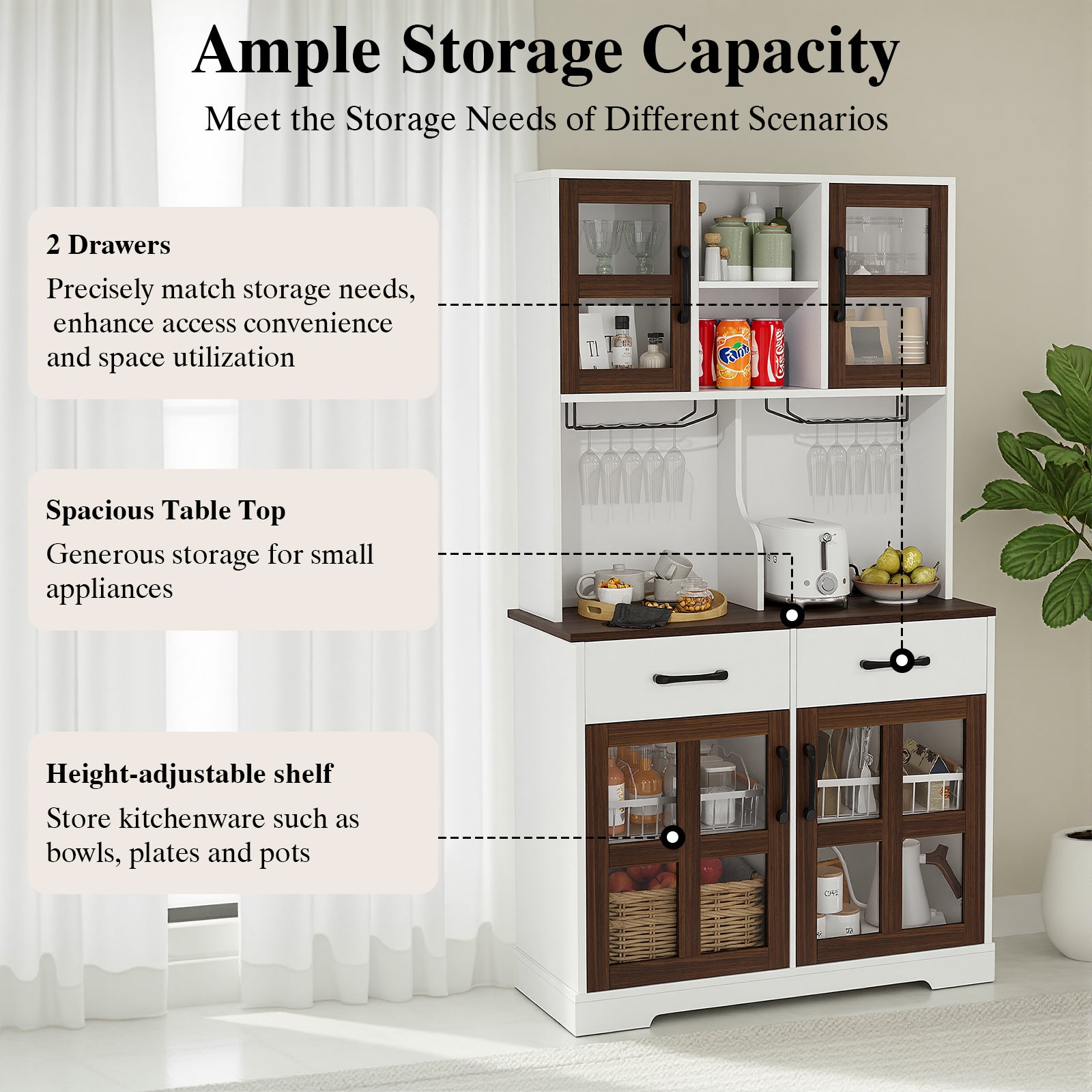 3. Ample Storage Capacity: Measuring 40" W × 16" D × 70" H, the cabinet provides multiple open shelves, enclosed compartments, and a spacious countertop. Perfect for organizing tableware, snacks, cookware, and small appliances while keeping your kitchen clutter-free.