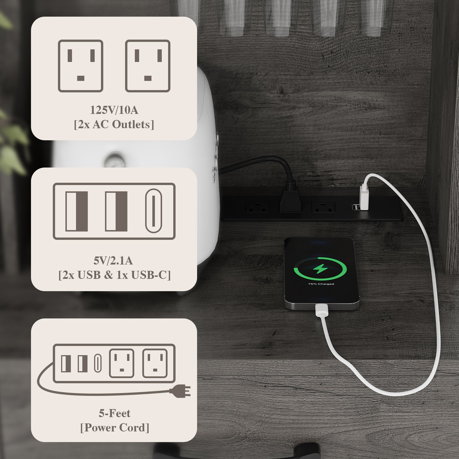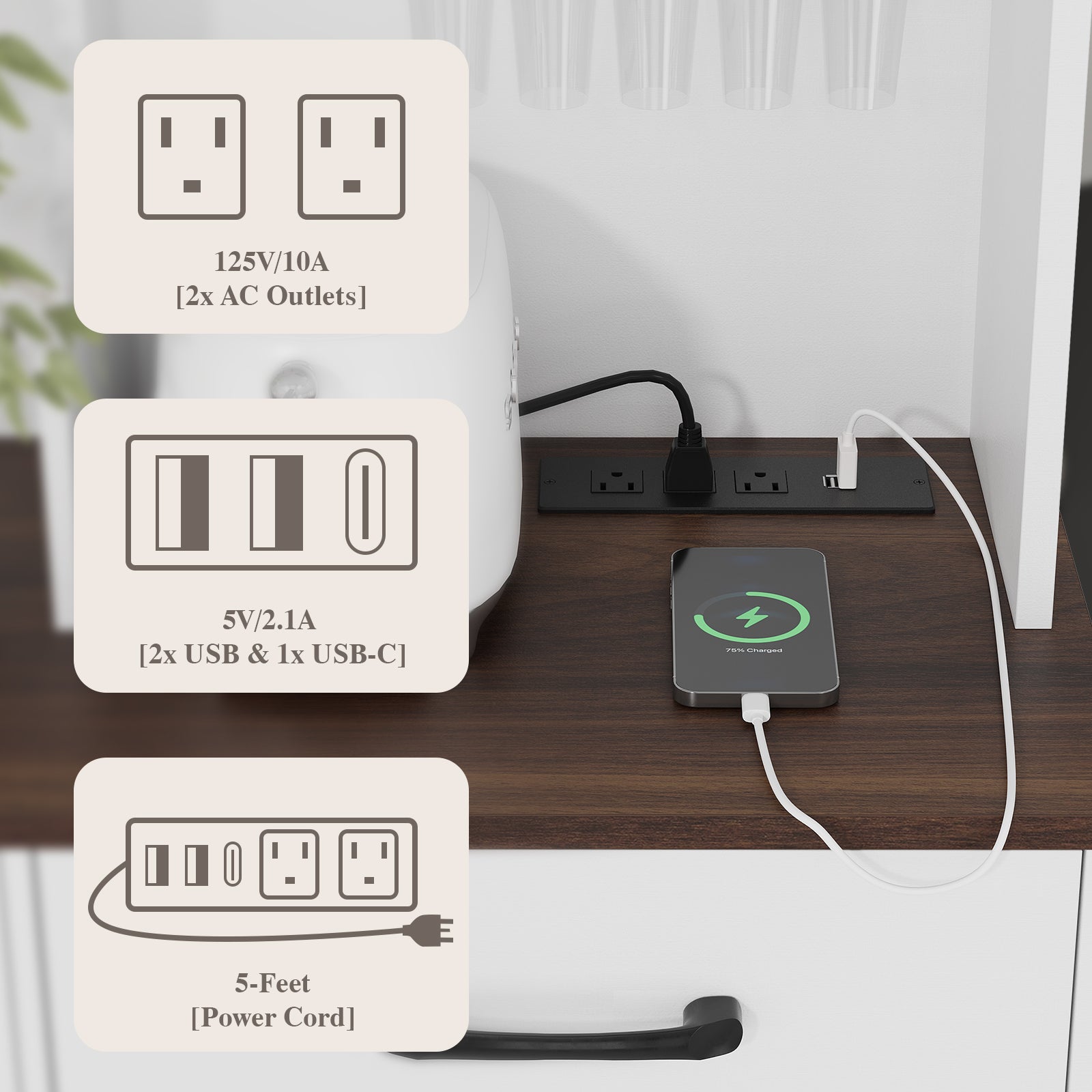 2. Built-In Power Station: Features two standard outlets, one USB port, and one Type-C port, allowing you to charge devices or power kitchen gadgets conveniently while keeping the countertop neat and functional.