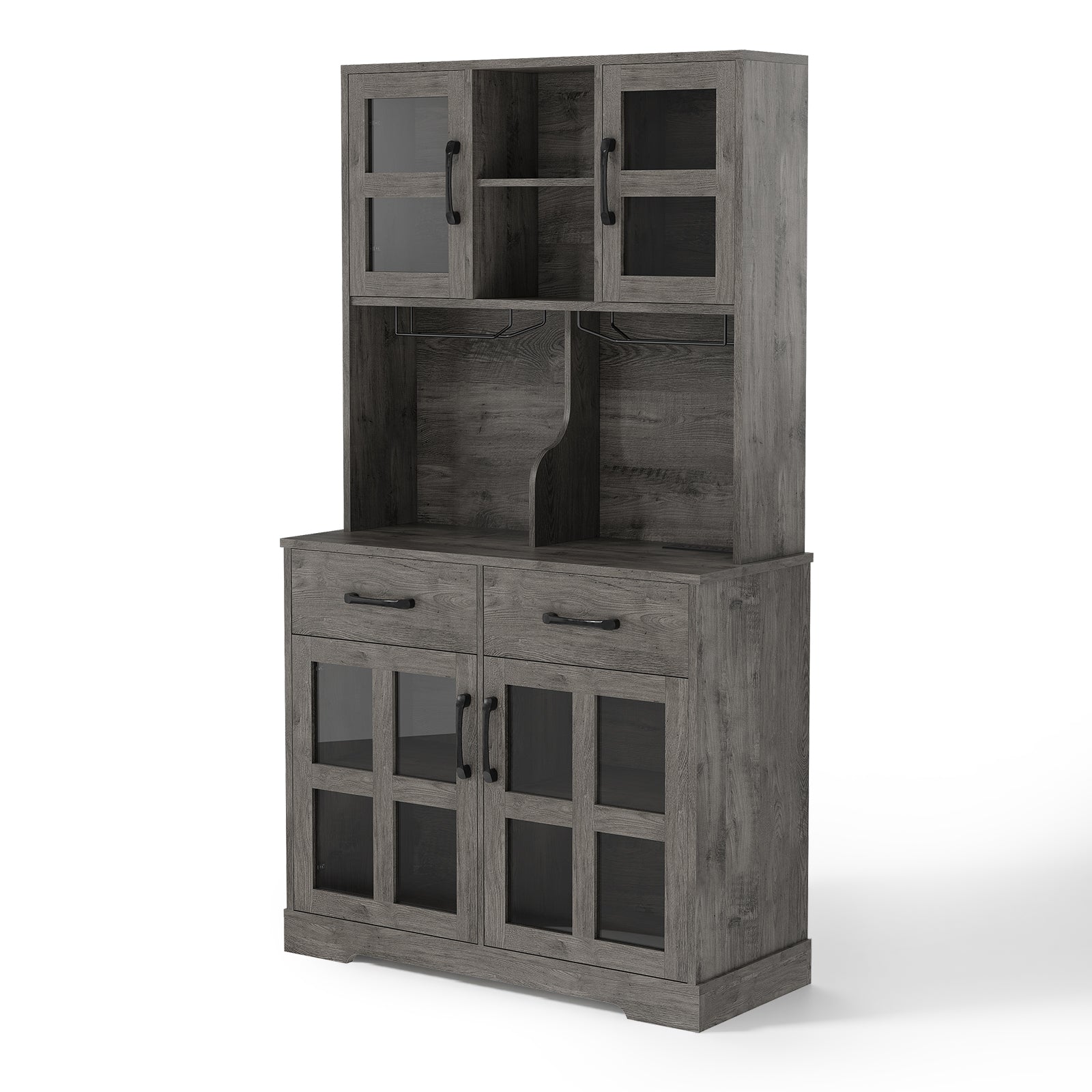 Save 50% - Modern Kitchen Pantry Cabinet with Power Outlet & Wine Glass Rack, Freestanding Hutch with Microwave Stand and Adjustable Shelves