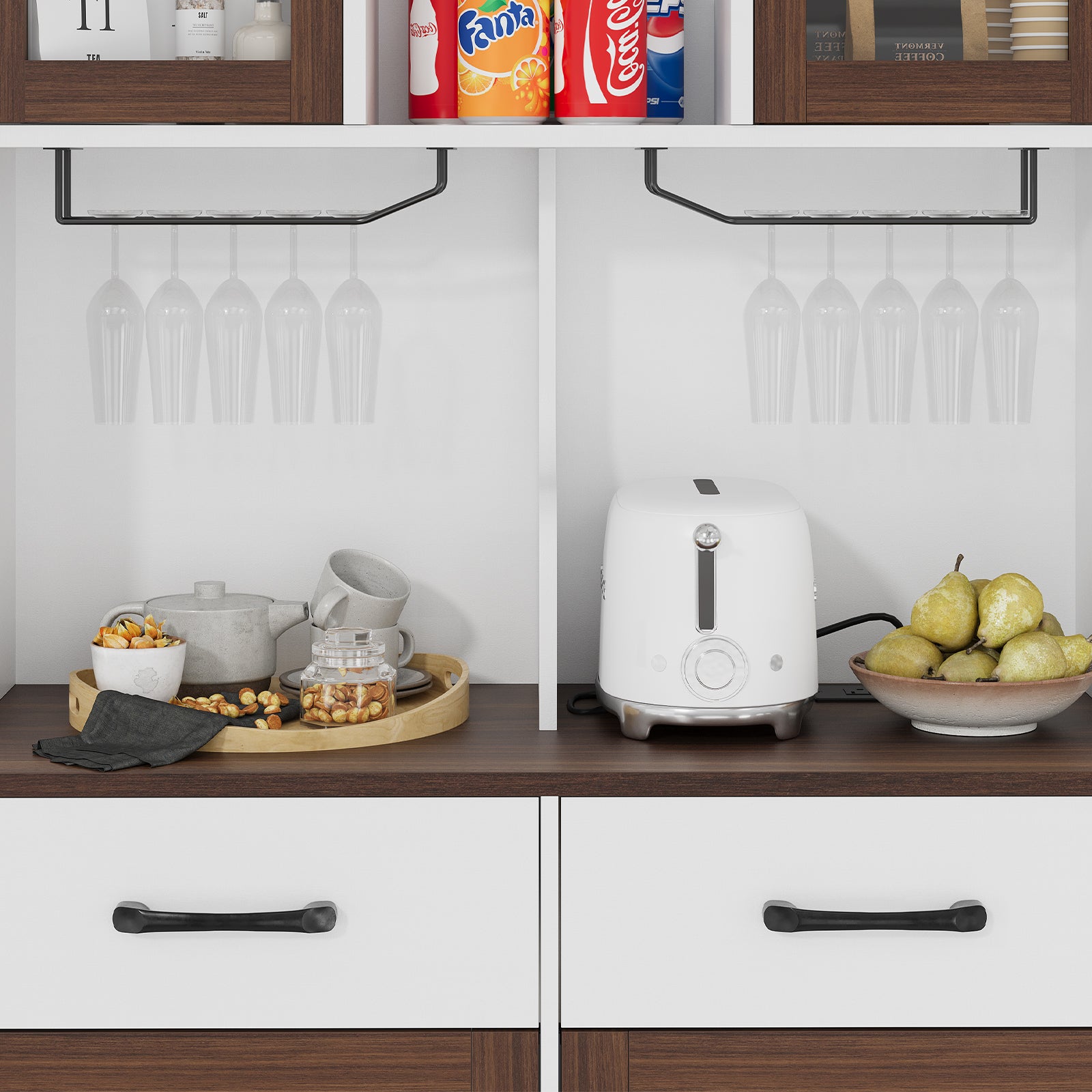 1. Durable Construction for Long-Term Use: Built from premium P2 engineered wood, this pantry cabinet ensures exceptional stability and longevity. The sturdy structure supports up to 300 lbs on the countertop—ideal for microwaves, coffee machines, and other heavy appliances.
