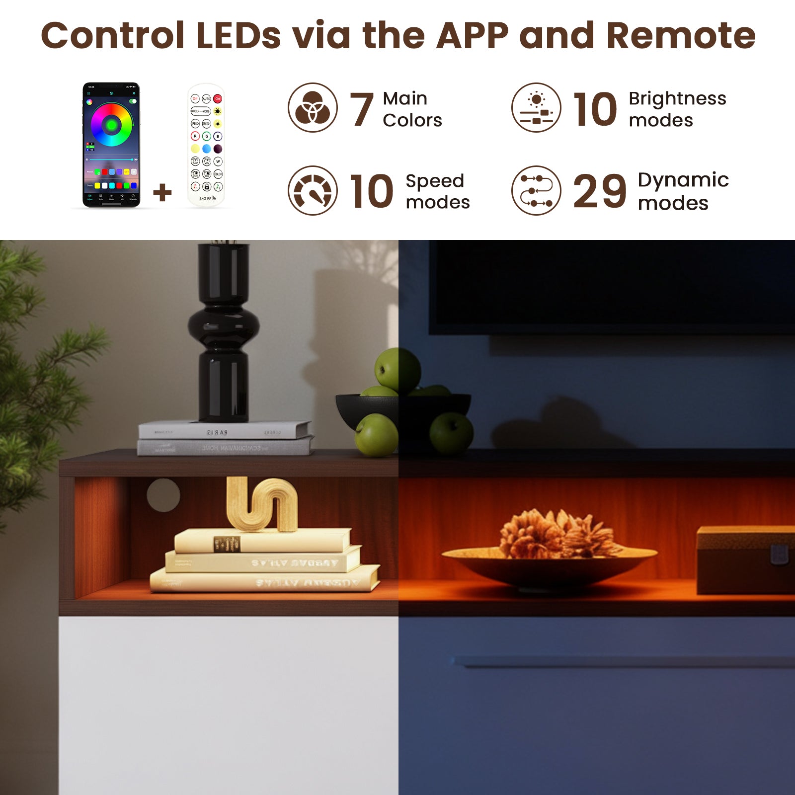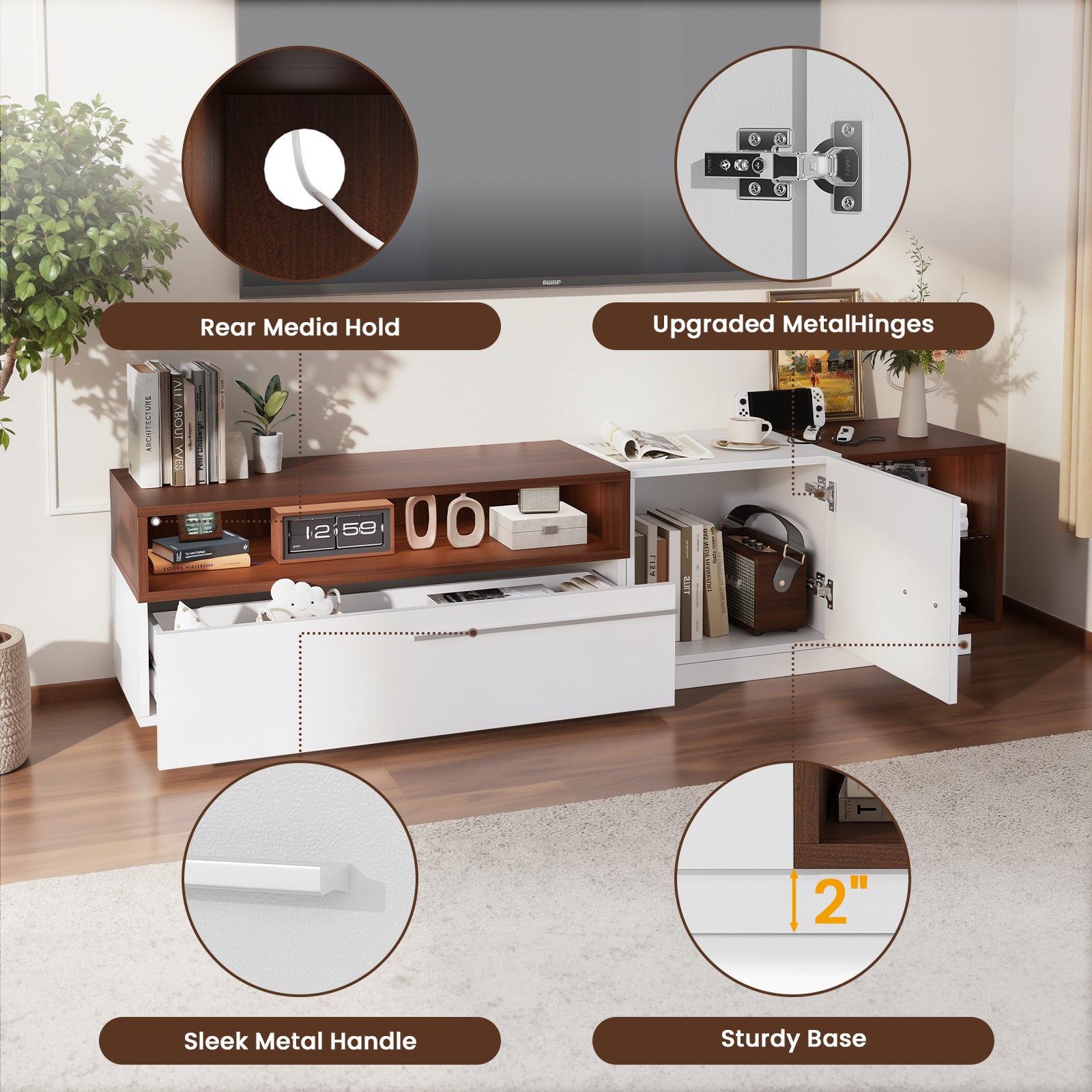 This modern minimalist TV stand combines functionality with elegant design to enhance any living space. Featuring a matte walnut finish with sleek white accents and an asymmetrical structure, it accommodates TVs up to 80 inches while adding a refined, contemporary touch. Built with durability, LED ambiance lighting, and ample storage options, it’s the perfect blend of style and practicality for today’s home entertainment setups.