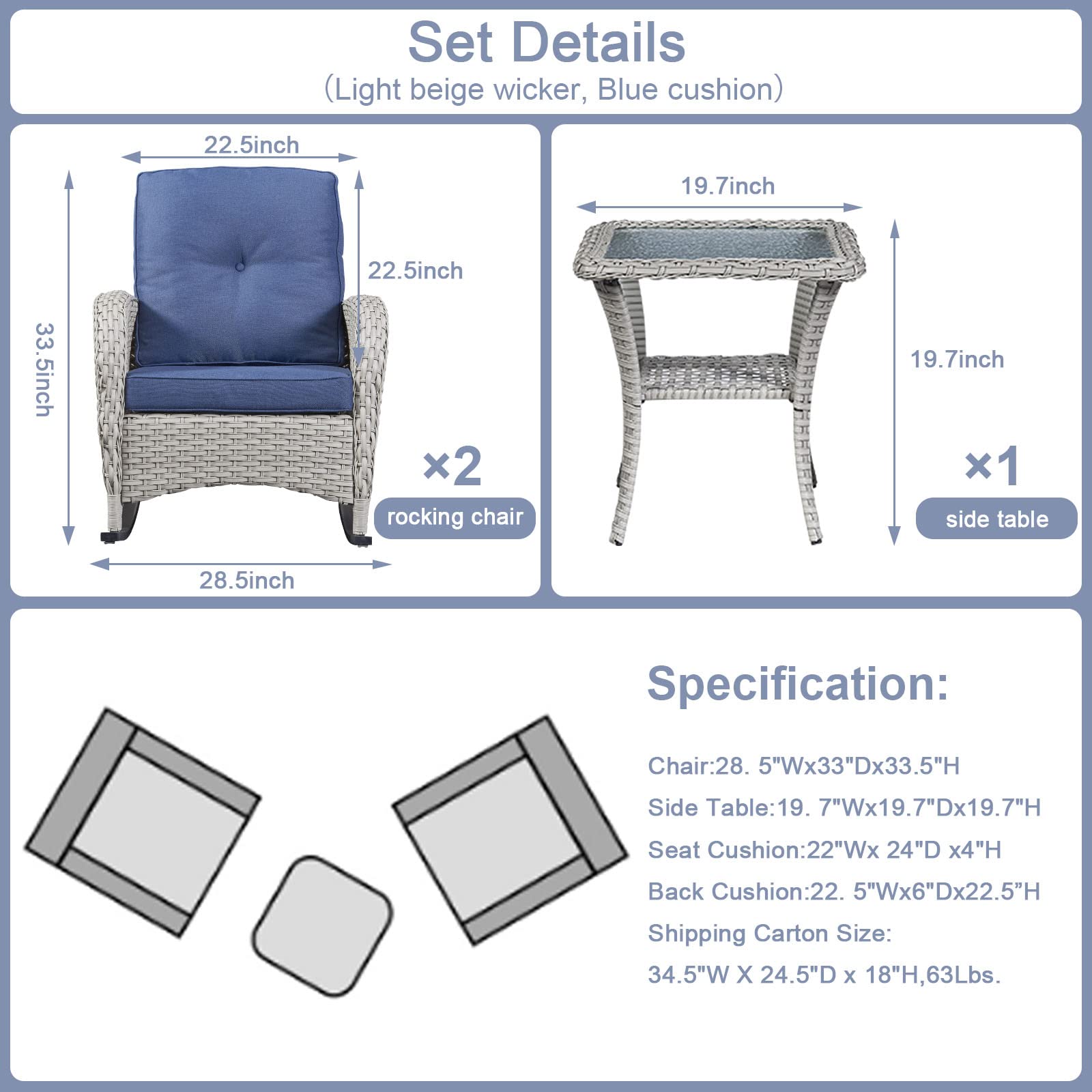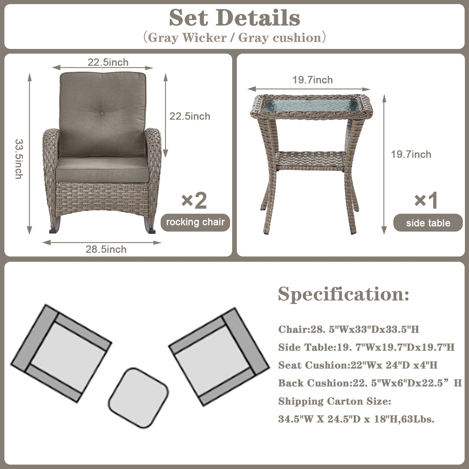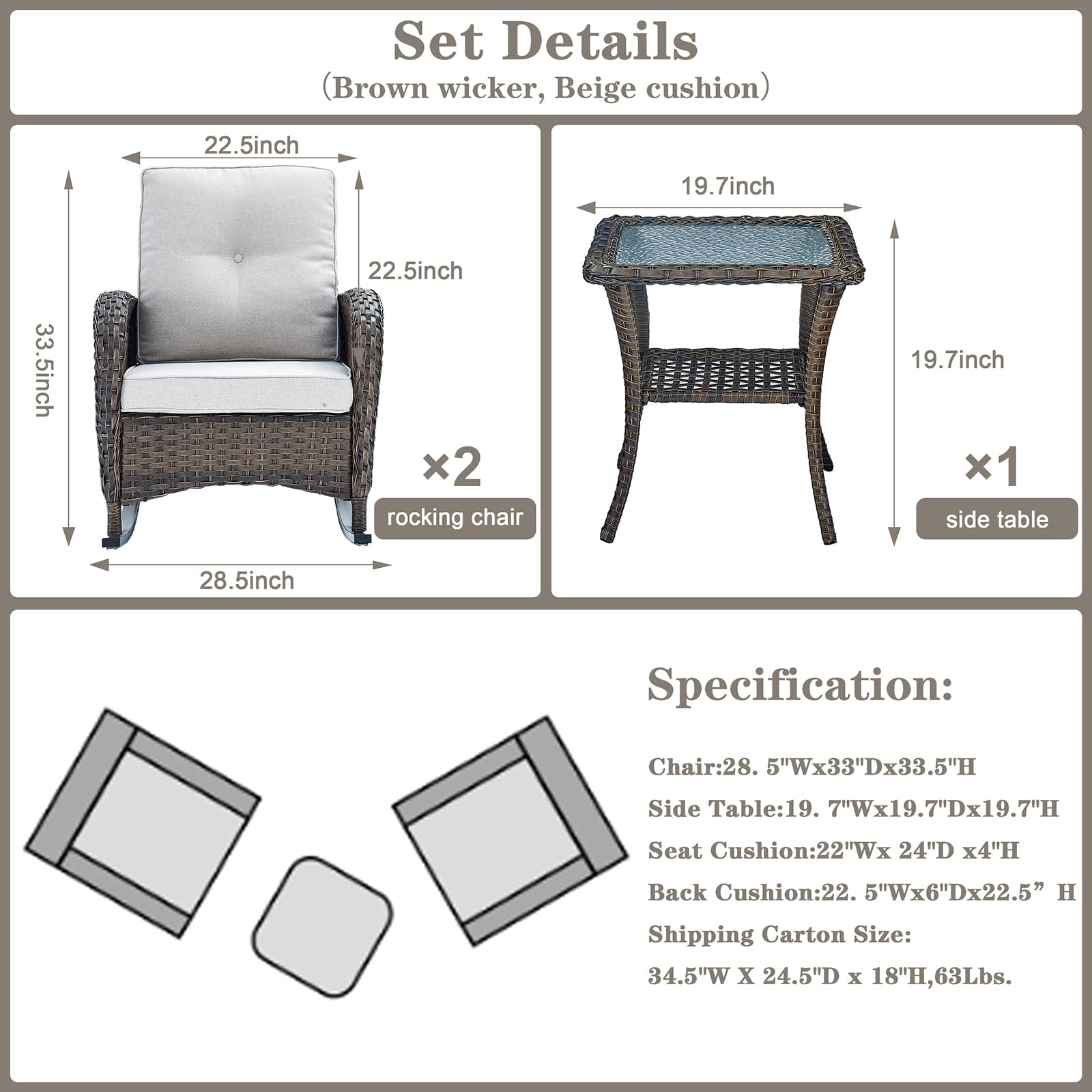 This patio wicker bench set includes a total of 2 hand-woven brown rattan rocking chairs and 1 side table, the rocking chairs measure 28.5 W*L 33*H 33.5 inches and the rocking chairs can hold up to 300 pounds. You will love this charming porch rocking chair that will make a huge difference in your outdoor lounge space.