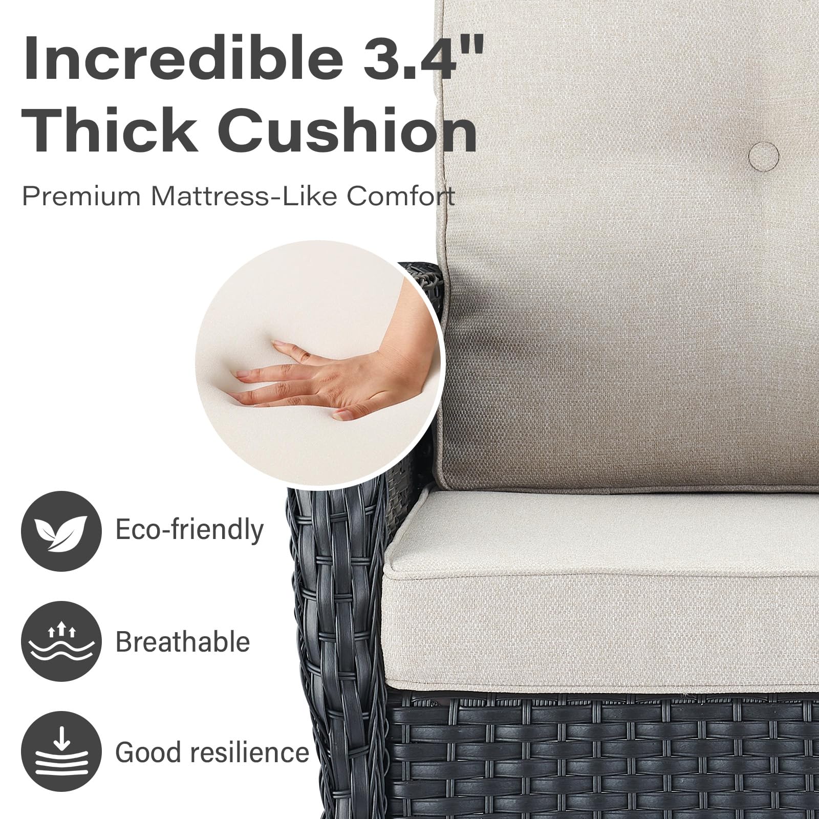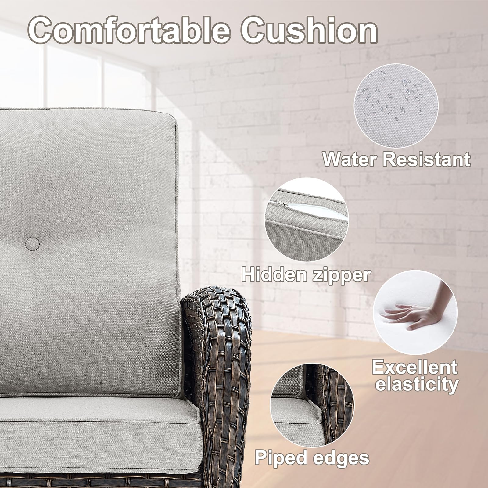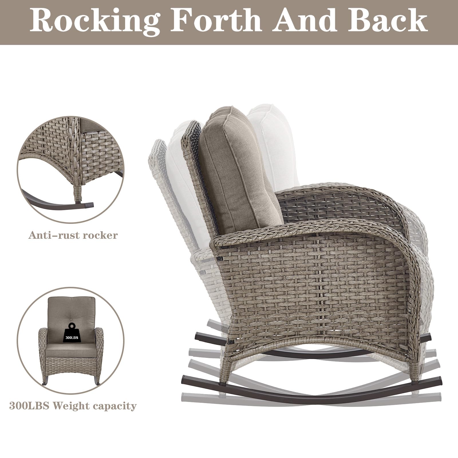 This patio wicker bench set includes a total of 2 hand-woven brown rattan rocking chairs and 1 side table, the rocking chairs measure 28.5 W*L 33*H 33.5 inches and the rocking chairs can hold up to 300 pounds. You will love this charming porch rocking chair that will make a huge difference in your outdoor lounge space.